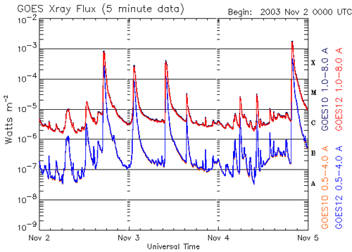The energy of the flare in the chart above appears to be no more than X-20, but it’s widely agreed that the source data from the GOES satellites were clipped at the top end; the interim consensus rendered a verdict of X-28 with some maintaining that it may have been as high as X-32. Later analysis of the series of explosions led NASA to judge the strength of a flare from October 28th as a whopping X-45. It should be pointed out that, until then, NASA scientists thought that they’d probably never see an X-10. For more on the violent spasm of 2003, see the Smithsonian’s Chandra X-Ray Observatory newsletter, March 2004.
